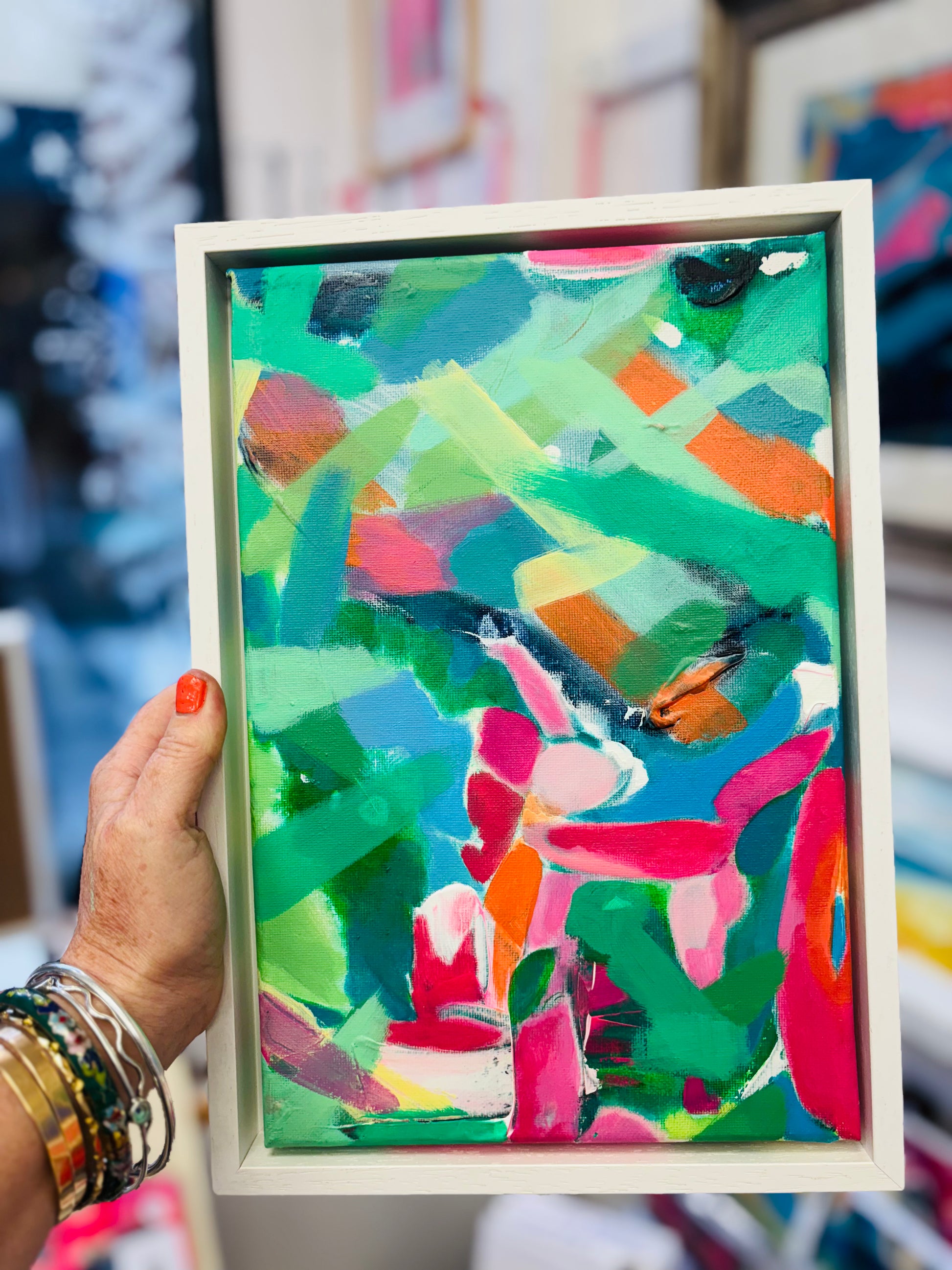 Acrylic on Canvas in a white floating frame.